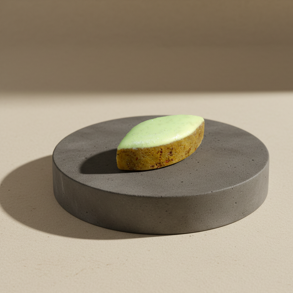 Une pâte de pistache, décorée d'une meringue vert pistache et de nacre argentée. Idéale pour les contrats de mariage.