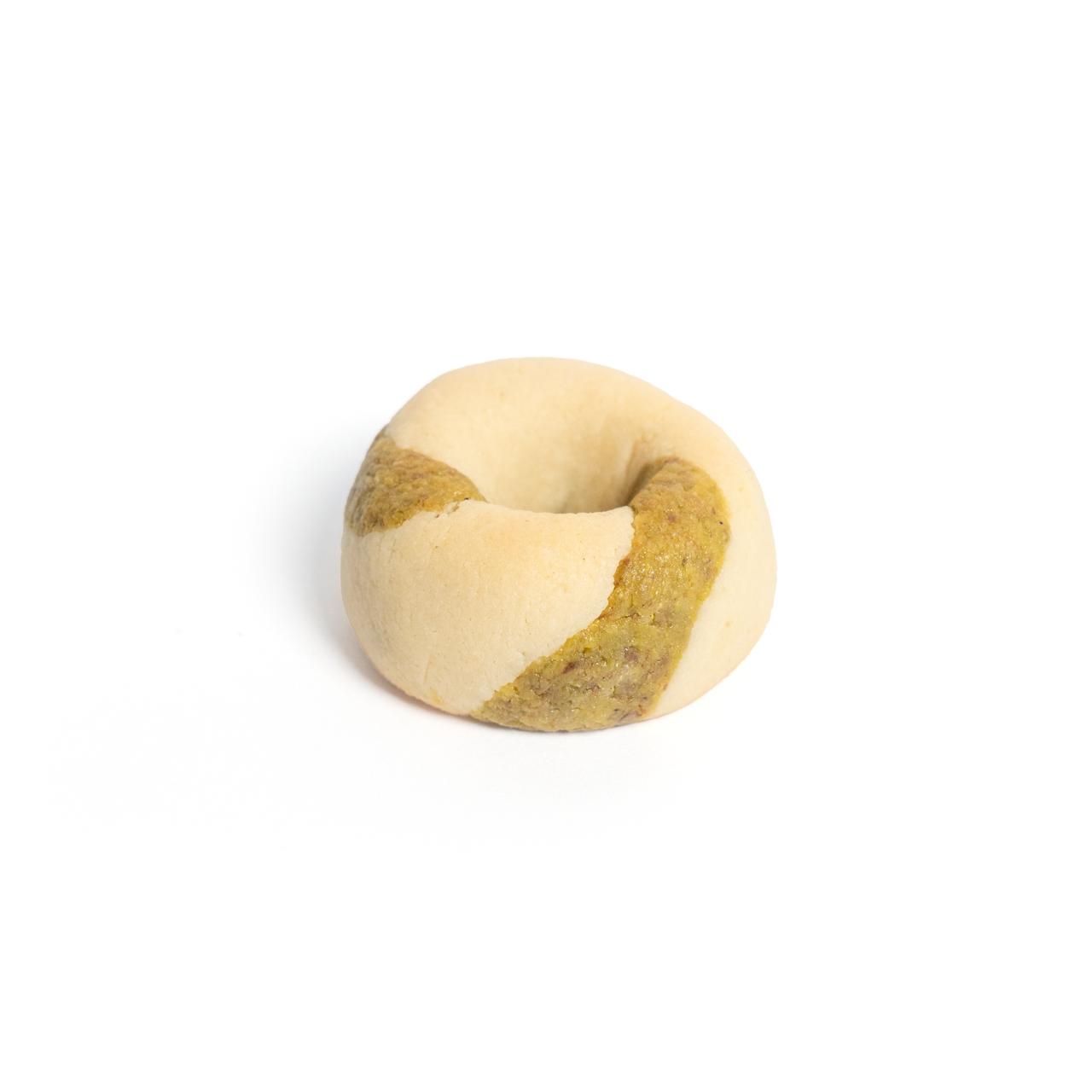 Eine raffinierte Interpretation des klassischen Kaak-Zopfs, die auf Ausgewogenheit und Zurückhaltung setzt. Fein gemahlene Mandeln bilden eine zarte, krümelige Hülle, die einen cremigen Pistazienkern mit subtilen floralen Noten von Rosenwasser und Vanille umschließt. Leicht mit Puderzucker gesüßt und sanft aufgegangen für einen luftigen Biss, ist dieser Kaak elegant und nicht schwer.
