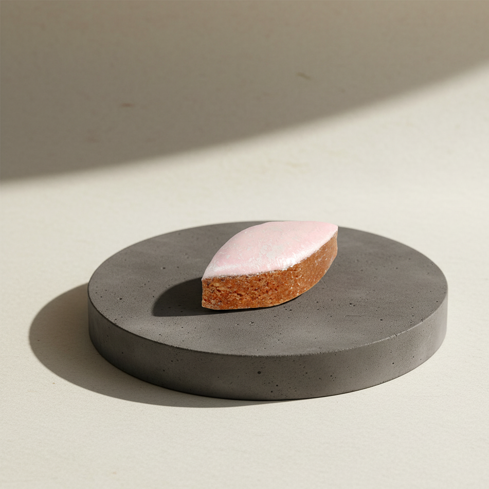 Eine Haselnusspaste, verziert mit einer hellrosa Baiserhaube und silbernem Perlmutt. Ideal für Hochzeitsverträge.